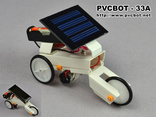 本项目是在31号光能摩托的基础上,增加了采用常规电池的电源背包,主体造型上还是三轮小车,所以同样依据所采用的太阳能电池板的形状的不同分为多个型号版本,包括采用方形太阳能电池板的33号A型光电混动小车(编号:PVCBOT-33A),采用圆形太阳能电池板的33号B型光电混动小车(编号:PVCBOT-33B),以及采用环形太阳能电池板的33号C型光电混动小车(编号:PVCBOT-33C)。
